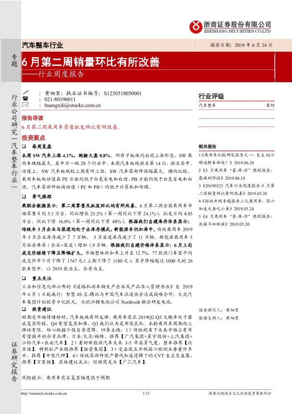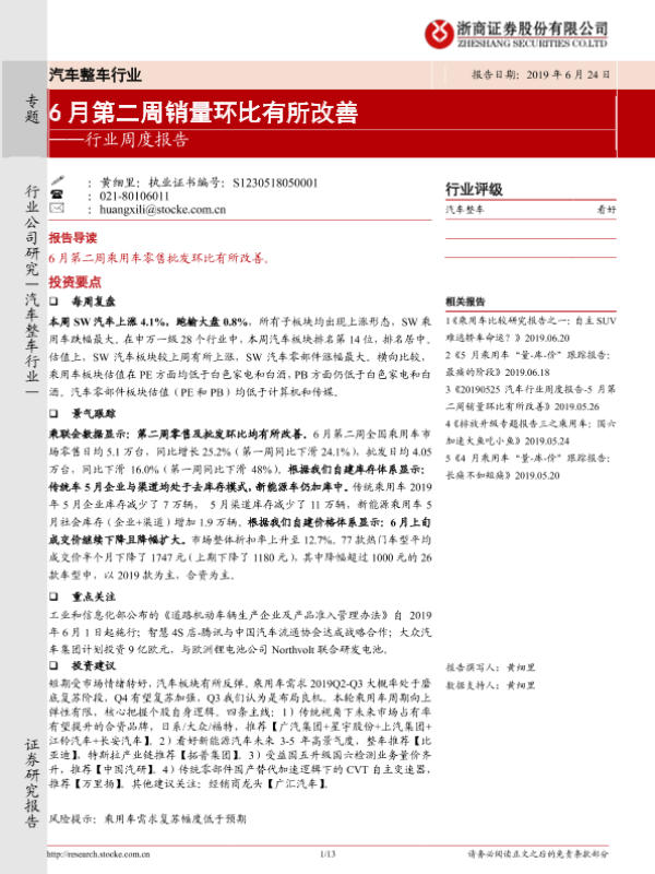 【浙商证券】【20190624】20190624-浙商证券-汽车整车行业周度报告:6月第二周销量环比有所改善-13页