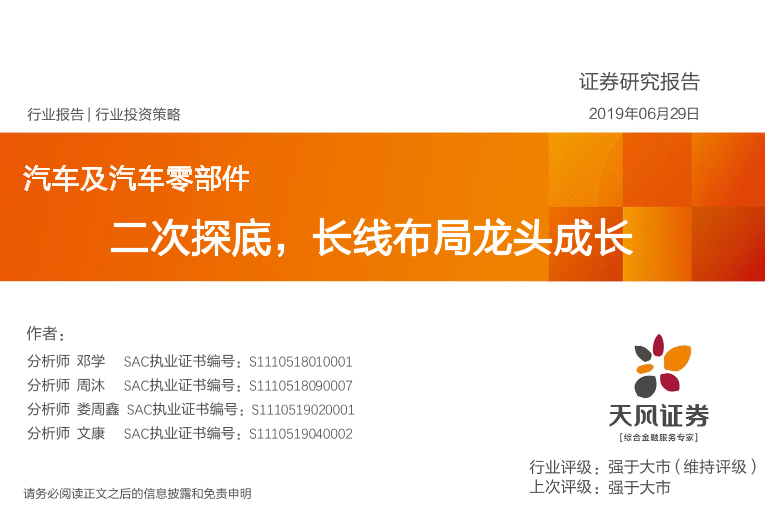 【天风证券】【20190629】汽车及汽车零部件行业投资策略:二次探底,长线布局龙头成长-45页