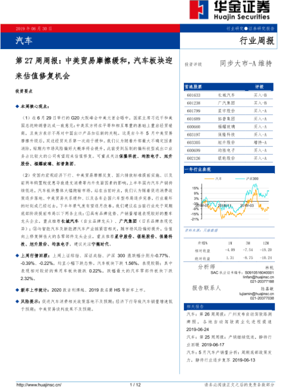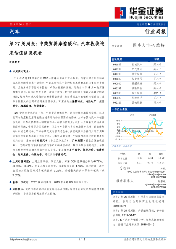 【华金证券】【20190630】汽车第27周周报:中美贸易摩擦缓和,汽车板块迎来估值修复机会-12页