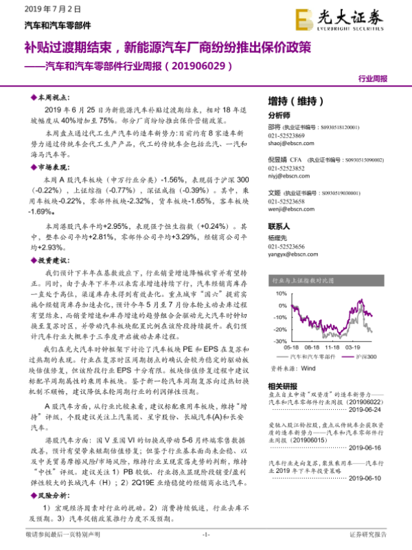 【光大证券】【20190702】汽车和汽车零部件行业周报:补贴过渡期结束,新能源汽车厂商纷纷推出保价政策-12页