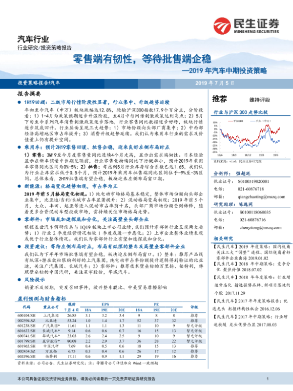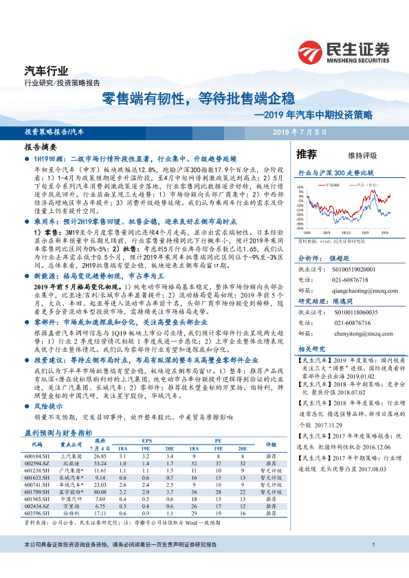 【民生证券】【20190705】2019年汽车中期投资策略:零售端有韧性,等待批售端企稳-20页