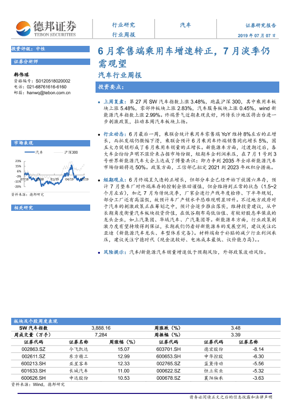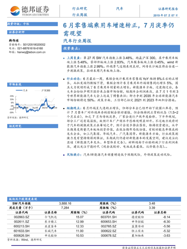 【德邦证券】【20190707】20190707-德邦证券-汽车行业周报:6月零售端乘用车增速转正,7月淡季仍需观望-11页
