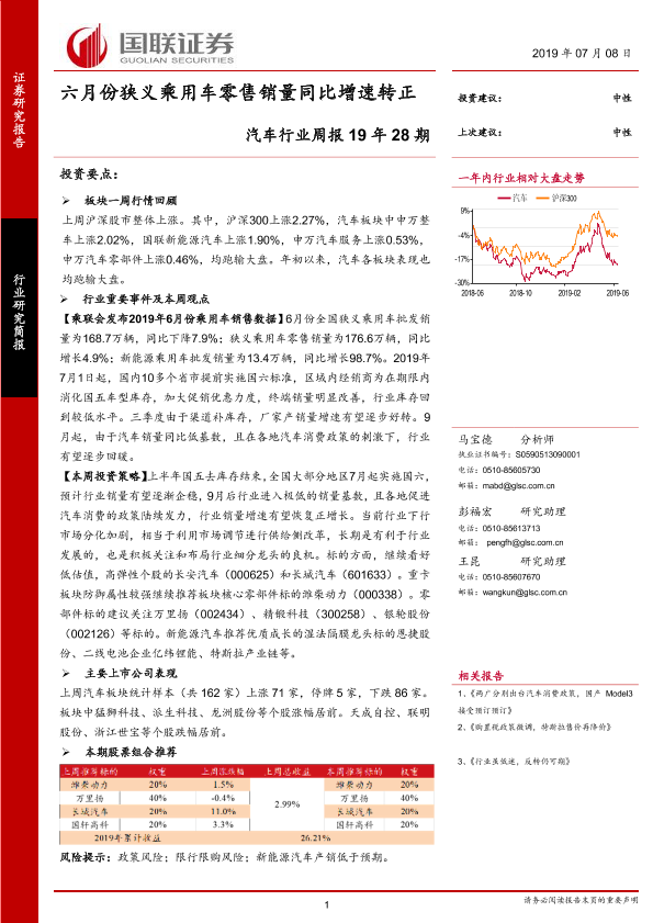 【国联证券】【20190708】六月份狭义乘用车零售销量同比增速转正-18页