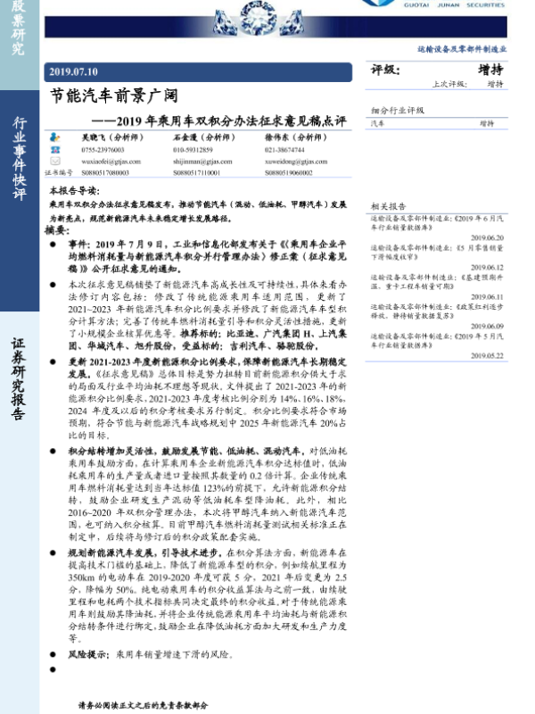 【国泰君安证券】【20190710】2019年乘用车双积分办法征求意见稿点评:节能汽车前景广阔-3页