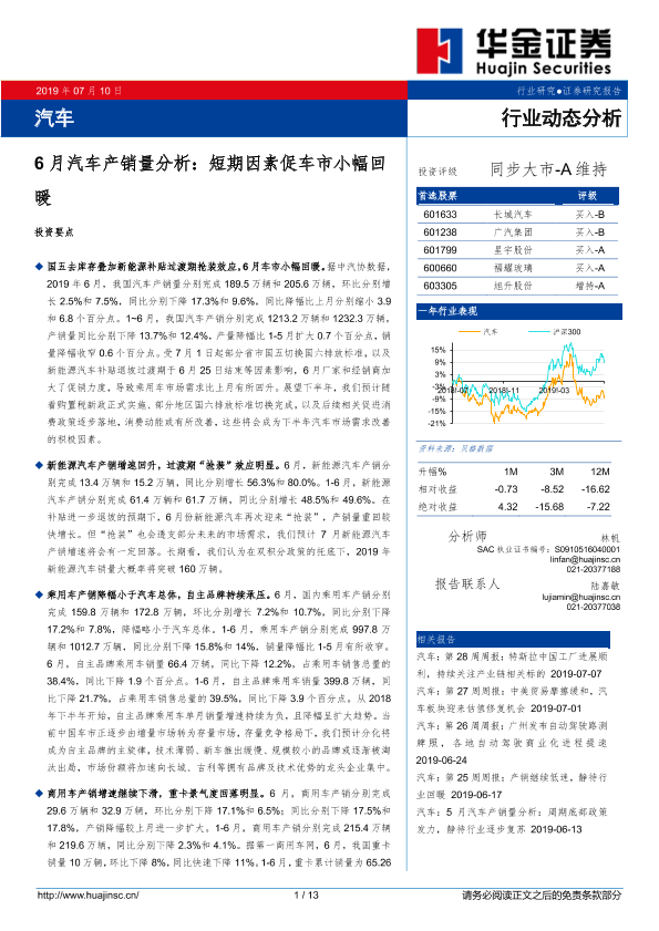 【华金证券】【20190710】6月汽车产销量分析:短期因素促车市小幅回暖-13页