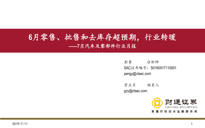 【财通证券】【20190711】7月汽车及零部件行业月报:6月零售、批售和去库存超预期,行业转暖-20页