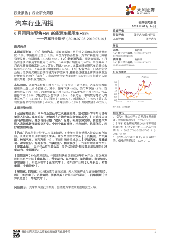 【天风证券】【20190714】20190714-天风证券-汽车行业研究周报:6月乘用车零售+5% 新能源车乘用车+88%-25页