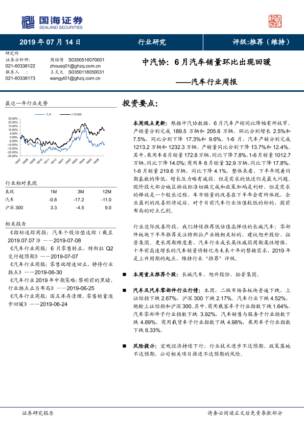 【国海证券】【20190714】20190714-国海证券-汽车行业周报:中汽协:6月汽车销量环比出现回暖-19页