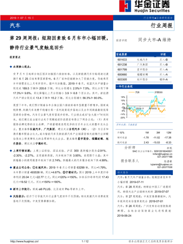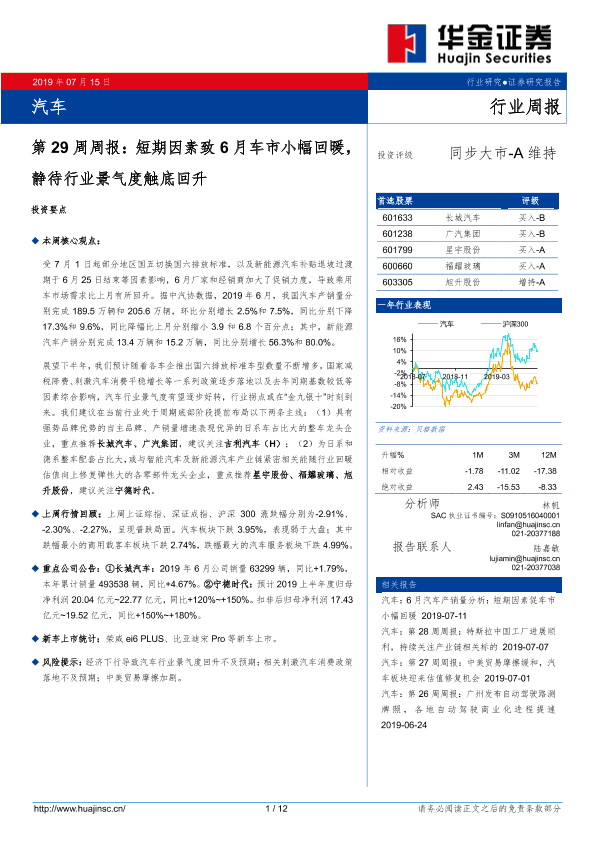 【华金证券】【20190715】汽车第29周周报:短期因素致6月车市小幅回暖,静待行业景气度触底回升-12页