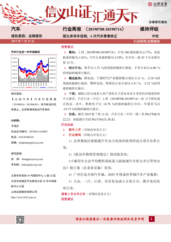 【山西证券】【20190715】20190715-山西证券-汽车行业周报:国五库存车促销,6月汽车零售转正-15页