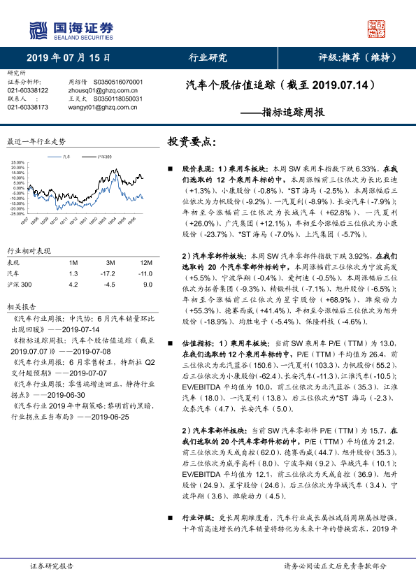 【国海证券】【20190715】指标追踪周报:汽车个股估值追踪(截至2019.07.14)-21页