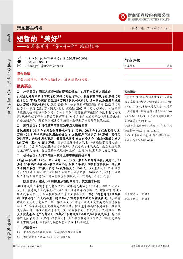 【浙商证券】【20190718】6月乘用车“量-库-价”跟踪报告:短暂的“美好”-7页