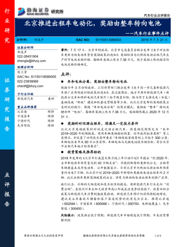 【渤海证券】【20190721】北京推进出租车电动化,奖励由整车转向电池-4页
