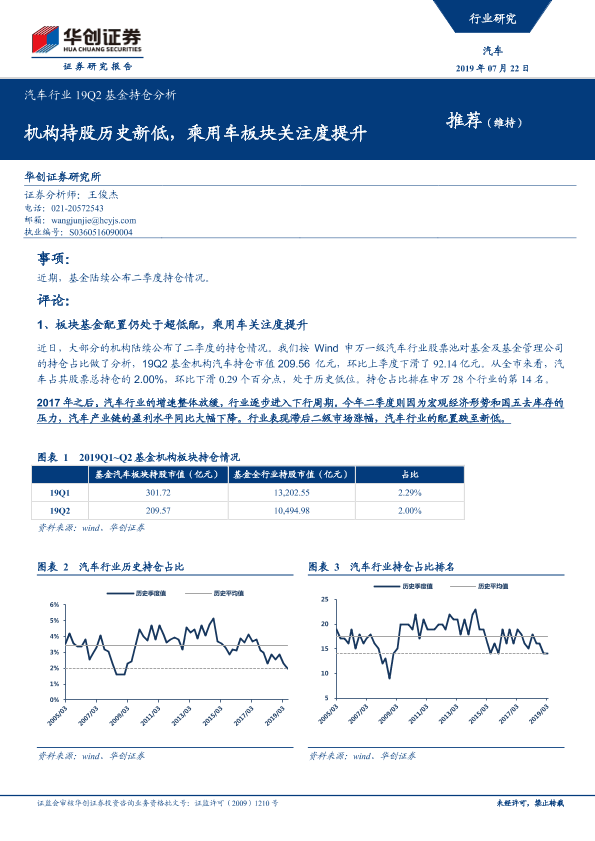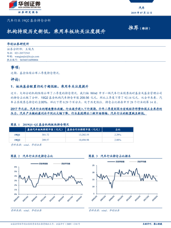 【华创证券】【20190722】汽车行业19Q2基金持仓分析:机构持股历史新低,乘用车板块关注度提升-6页