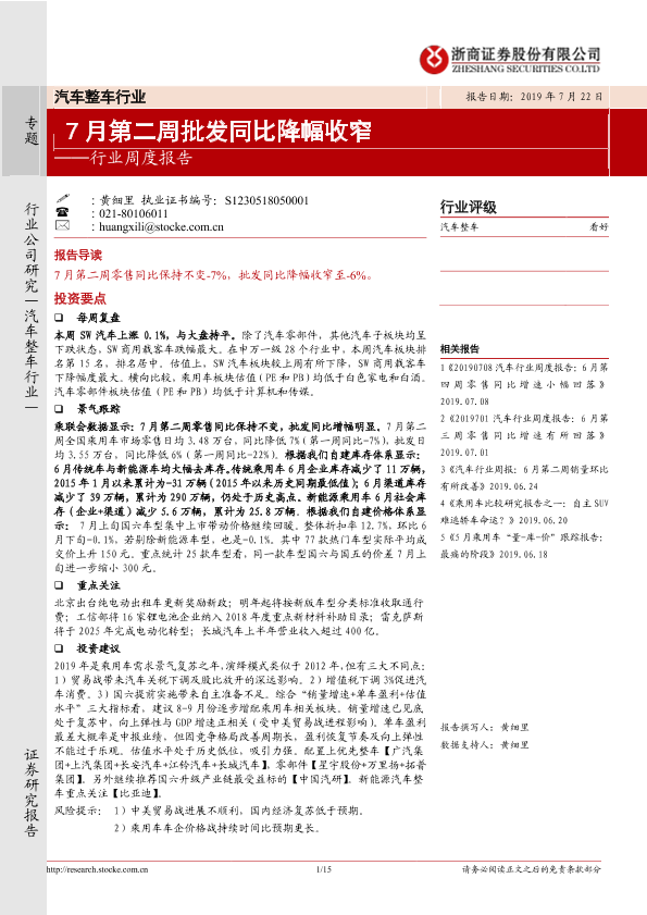 【浙商证券】【20190722】汽车整车行业周度报告:7月第二周批发同比降幅收窄-15页