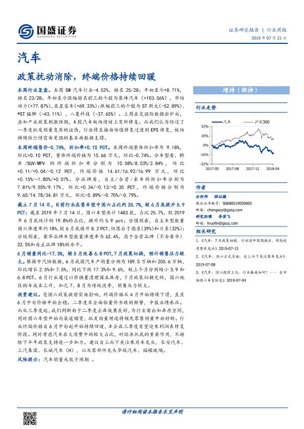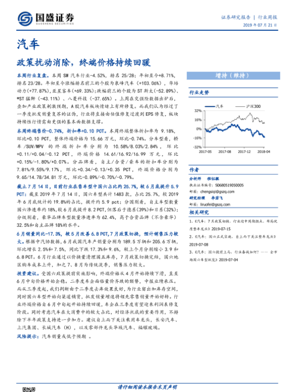 【国盛证券】【20190721】20190721-国盛证券-汽车行业周报:政策扰动消除,终端价格持续回暖-15页