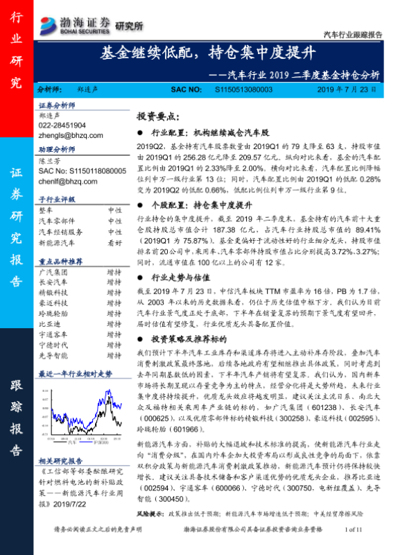 【渤海证券】【20190723】汽车行业2019二季度基金持仓分析:基金继续低配,持仓集中度提升-11页