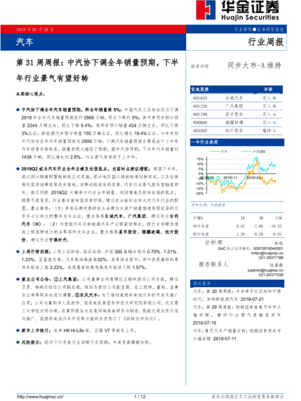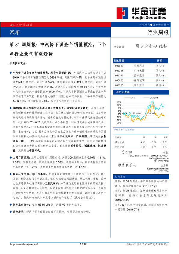 【华金证券】【20190728】汽车第31周周报:中汽协下调全年销量预期,下半年行业景气有望好转-12页