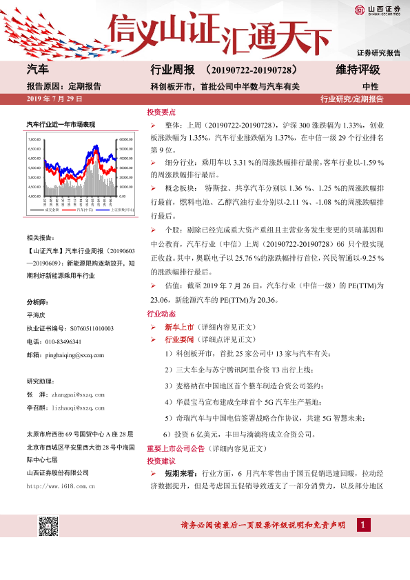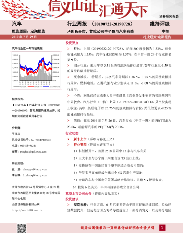 【山西证券】【20190729】20190729-山西证券-汽车行业周报:科创板开市,首批公司中半数与汽车有关-15页