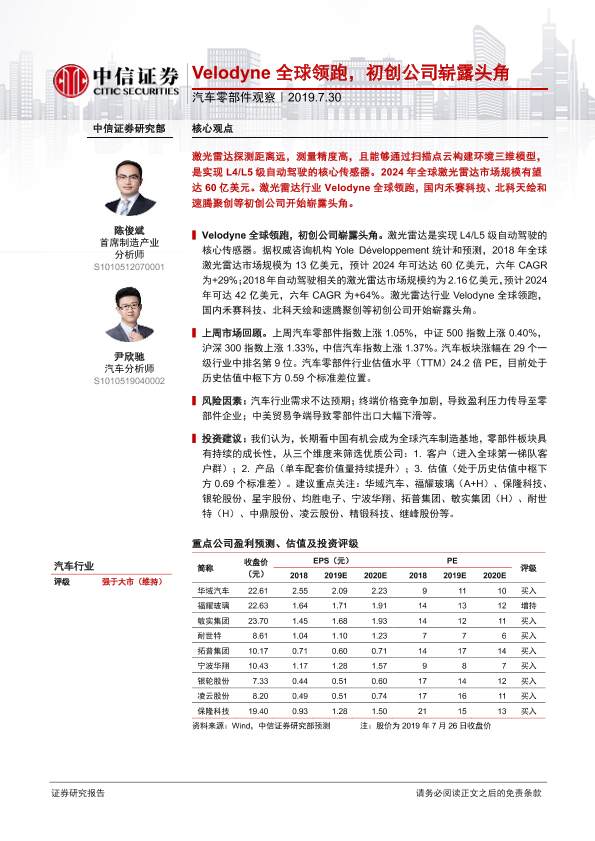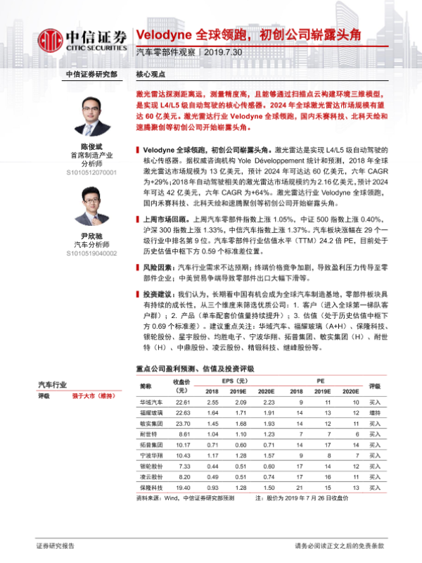 【中信证券】【20190730】汽车零部件观察:Velodyne全球领跑,初创公司崭露头角-12页