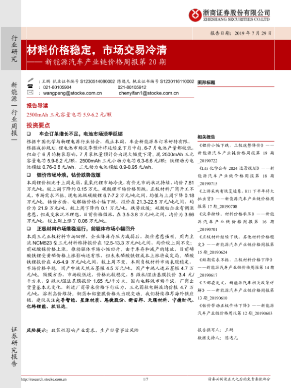 【浙商证券】【20190729】20190729-浙商证券-新能源汽车产业链价格周报第20期:材料价格稳定,市场交易冷清-7页