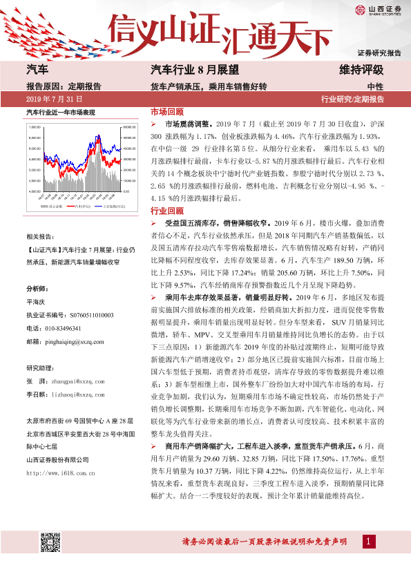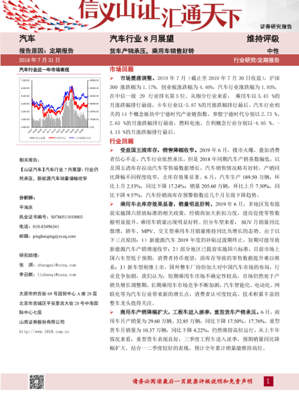 【山西证券】【20190731】汽车行业8月展望:货车产销承压,乘用车销售好转-29页