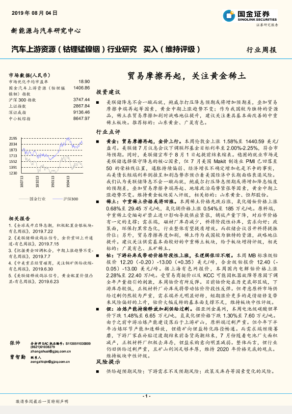 【国金证券】【20190804】20190804-国金证券-汽车上游资源(钴锂锰镍铟)行业研究:贸易摩擦再起,关注黄金稀土-8页