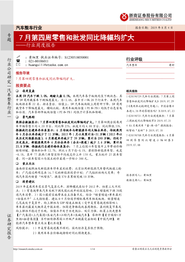 【浙商证券】【20190804】汽车整车行业:7月第四周零售和批发同比降幅均扩大-14页