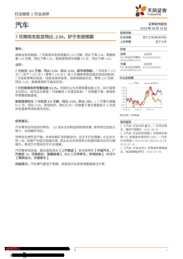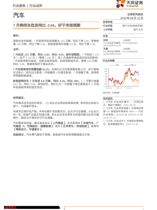【天风证券】【20190810】汽车行业点评:7月乘用车批发同比-2.6%,好于市场预期-11页