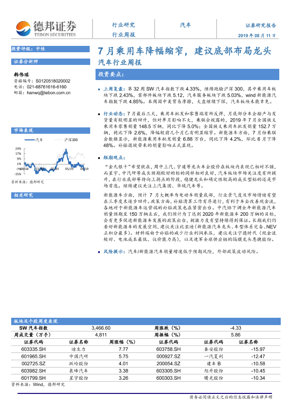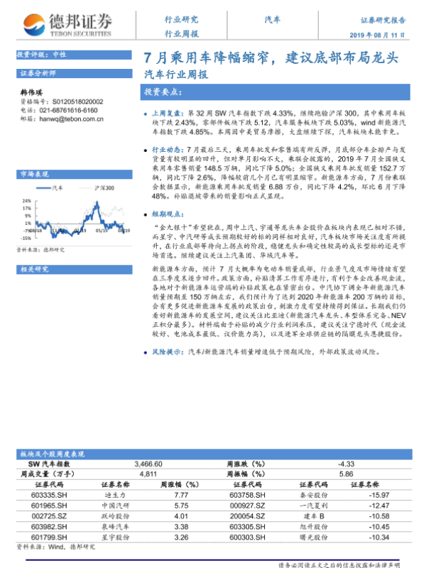 【德邦证券】【20190811】20190811-德邦证券-汽车行业周报:7月乘用车降幅缩窄,建议底部布局龙头-10页