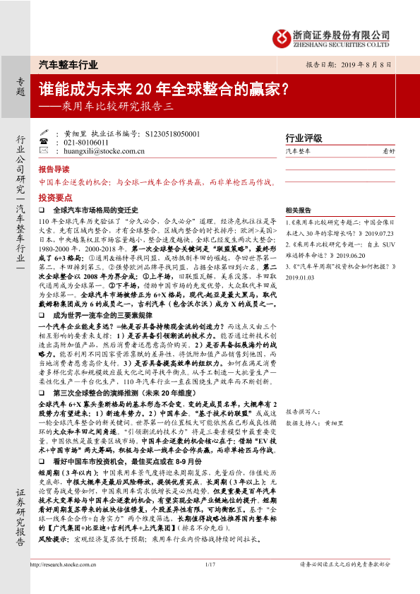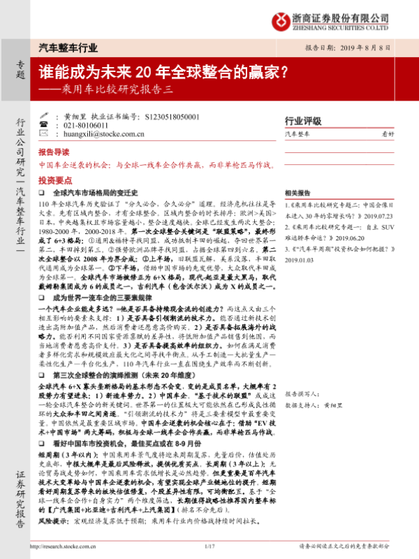 乘用车市场 全球整合 技术联盟 投资机会 汽车行业