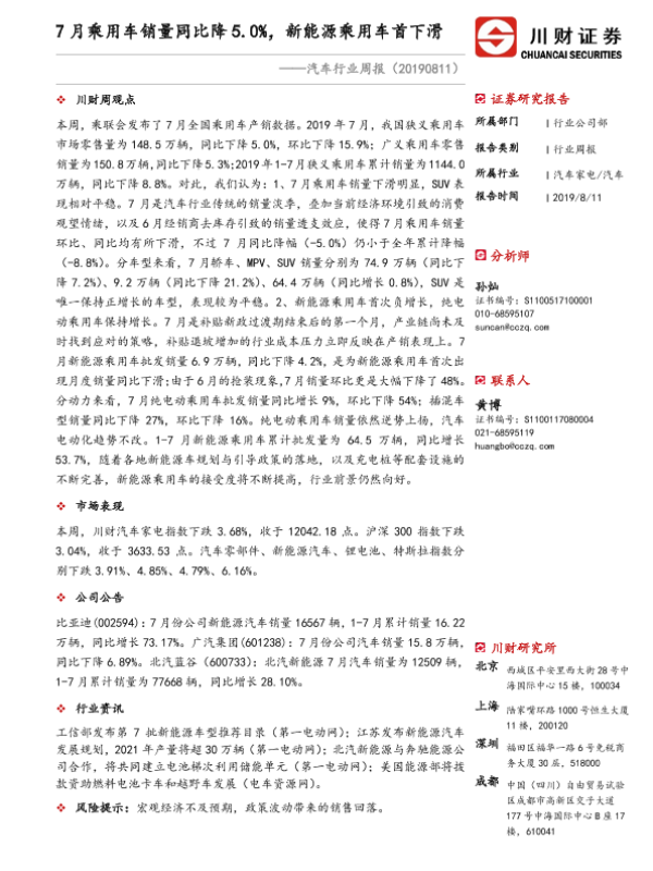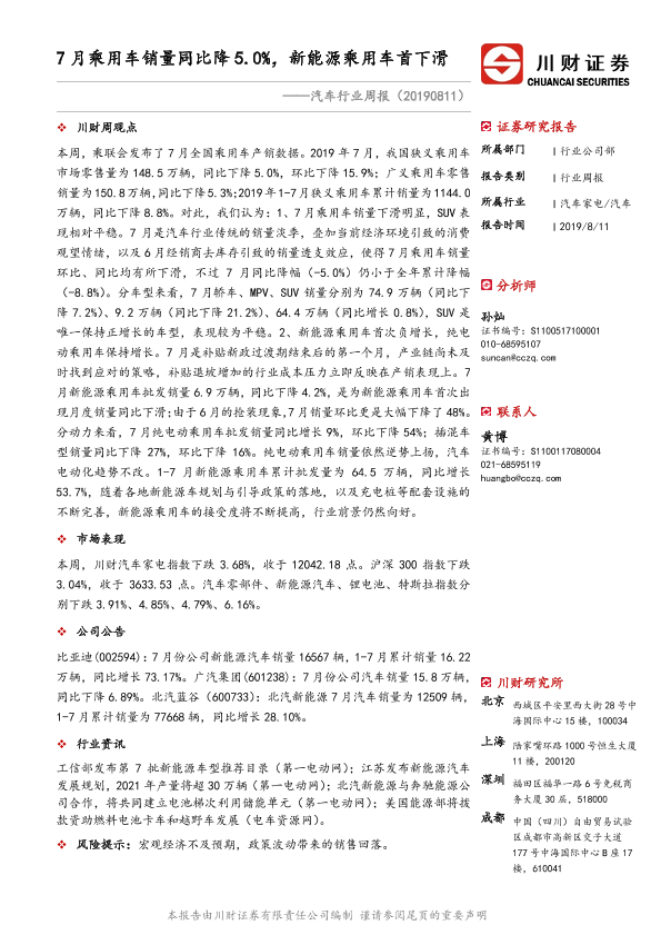 【川财证券】【20190811】20190811-川财证券-汽车行业周报:7月乘用车销量同比降5.0%,新能源乘用车首下滑-10页