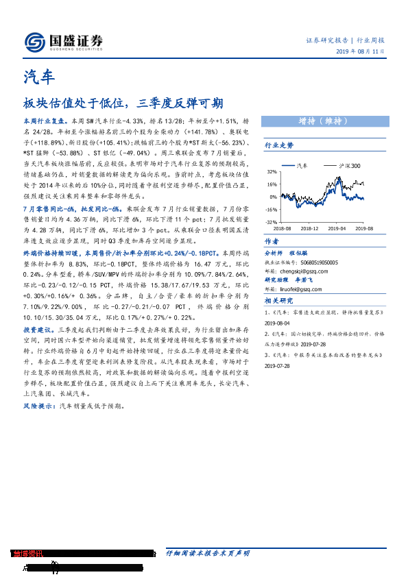 【国盛证券】【20190811】20190811-国盛证券-汽车行业周报:板块估值处于低位,三季度反弹可期-16页