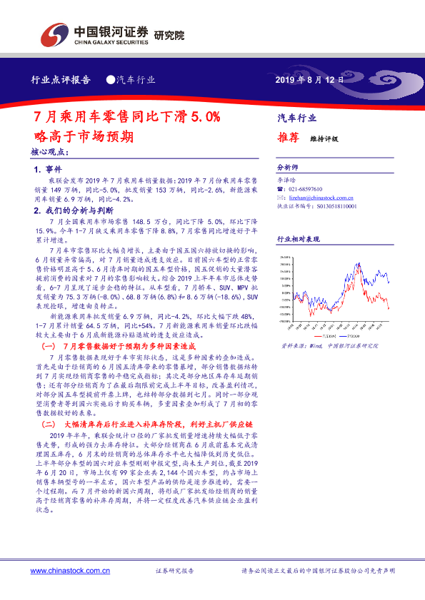 【银河证券】【20190812】汽车行业:7月乘用车零售同比下滑5.0% 略高于市场预期-4页