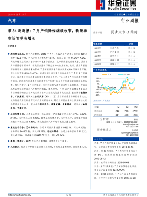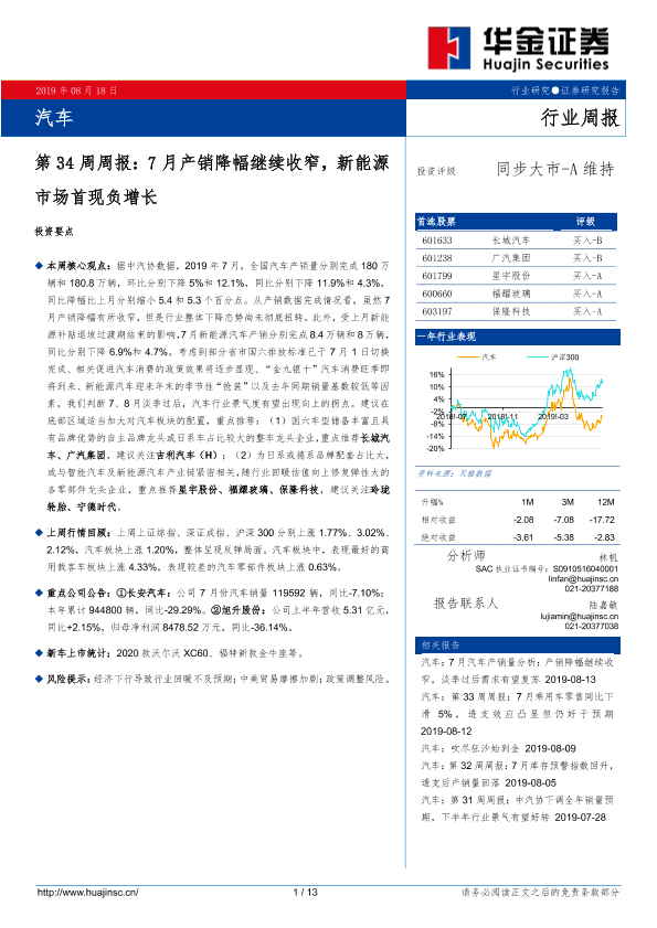 【华金证券】【20190818】汽车第34周周报:7月产销降幅继续收窄,新能源市场首现负增长-13页