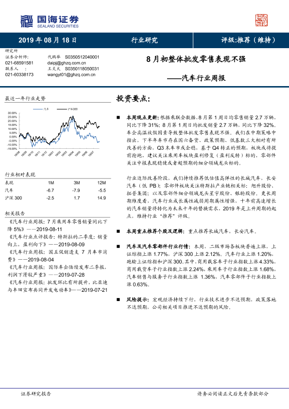 【国海证券】【20190818】20190818-国海证券-汽车行业周报:8月初整体批发零售表现不强-16页