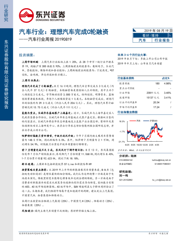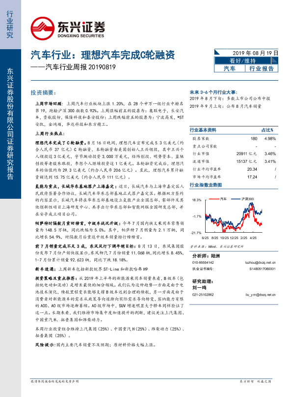 【东兴证券】【20190819】汽车行业周报:理想汽车完成C轮融资-14页