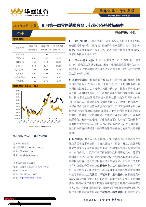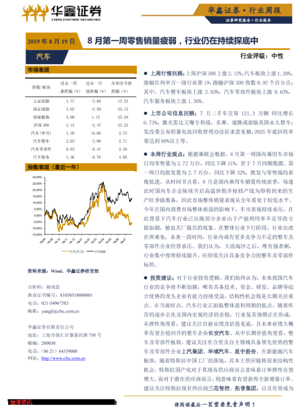 【华鑫证券】【20190819】20190819-华鑫证券-汽车行业周报:8月第一周零售销量疲弱,行业仍在持续探底中-20页