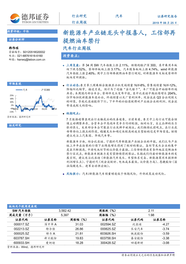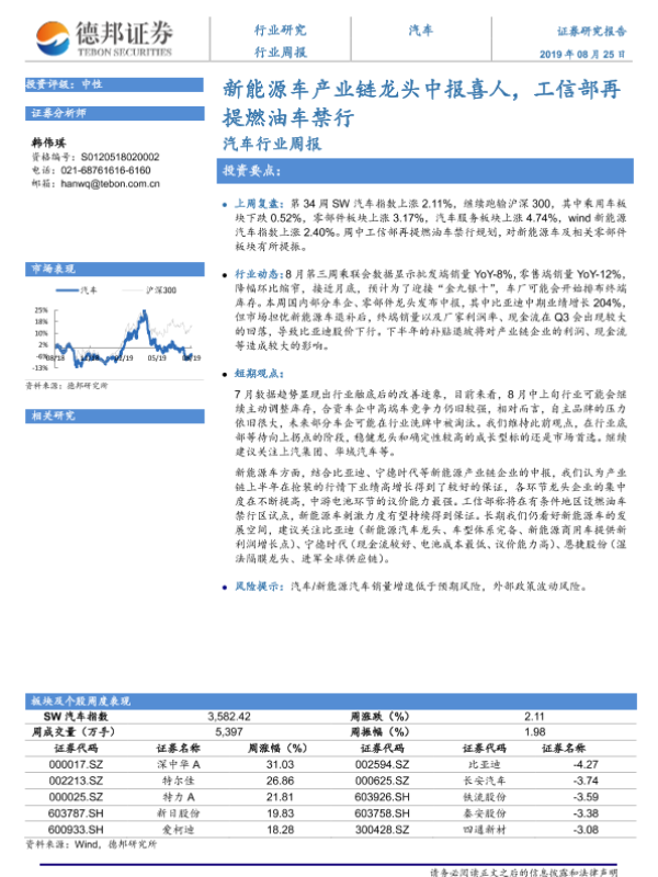 【德邦证券】【20190825】20190825-德邦证券-汽车行业周报:新能源车产业链龙头中报喜人,工信部再提燃油车禁行-12页