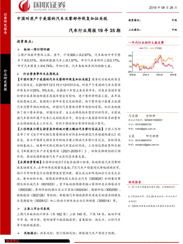 【国联证券】【20190826】20190826-国联证券-汽车行业周报19年35期:中国对原产于美国的汽车及零部件恢复加征关税-17页