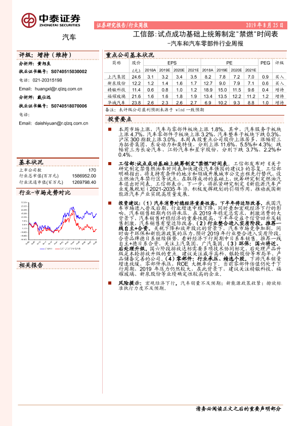 【中泰证券】【20190825】汽车和汽车零部件行业周报:工信部 试点成功基础上统筹制定'禁燃'时间表-10页