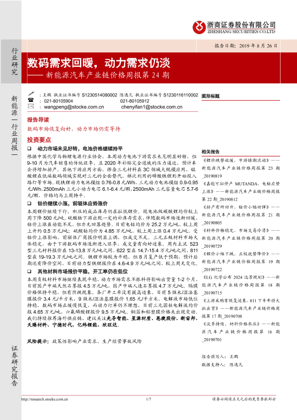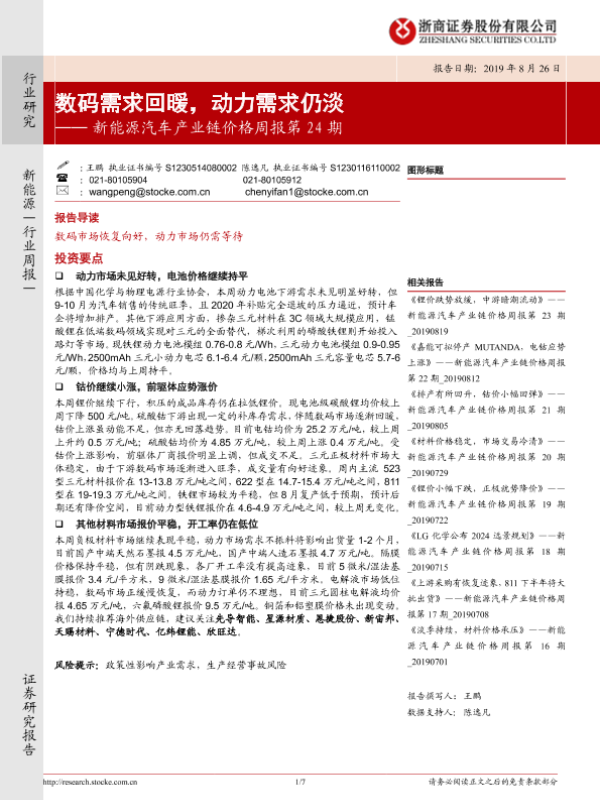 【浙商证券】【20190826】新能源汽车产业链价格周报第24期:数码需求回暖,动力需求仍淡-7页