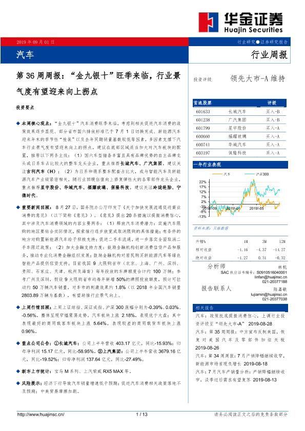 【华金证券】【20190901】汽车行业第36周周报:“金九银十”旺季来临,行业景气度有望迎来向上拐点-13页