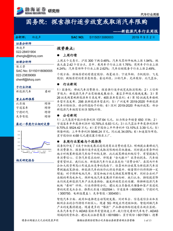 【渤海证券】【20190902】20190902-渤海证券-新能源汽车行业周报:国务院:探索推行逐步放宽或取消汽车限购-13页
