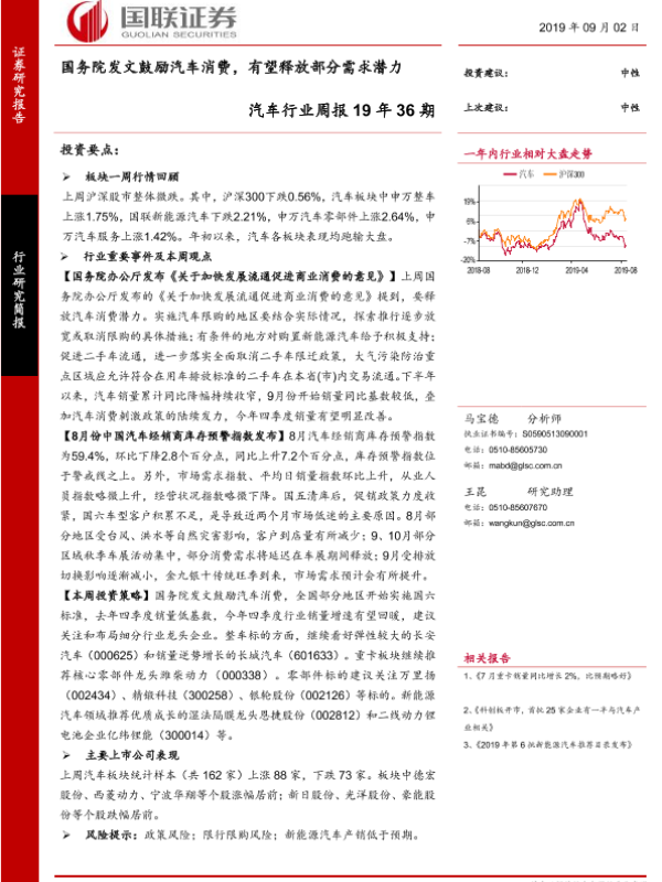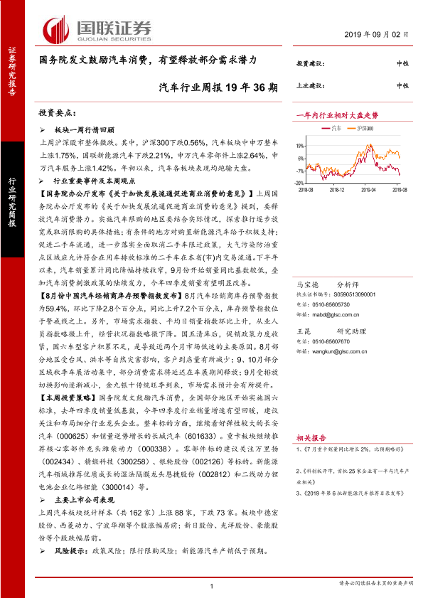 【国联证券】【20190902】国联证券-汽车行业周报19年36期:国务院发文鼓励汽车消费,有望释放部分需求潜力-19页