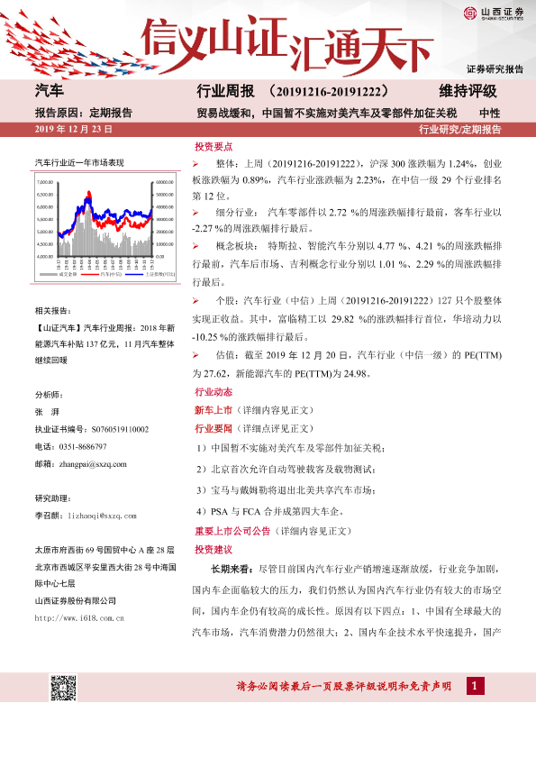 【山西证券】【20191223】汽车行业周报:贸易战缓和,中国暂不实施对美汽车及零部件加征关税-14页