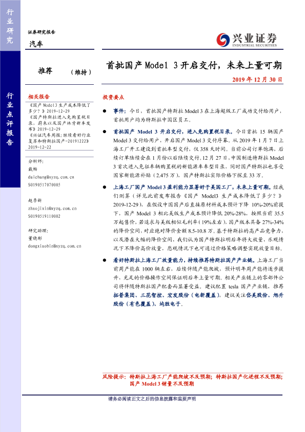 【兴业证券】【20191230】首批国产Model 3开启交付,未来上量可期-3页