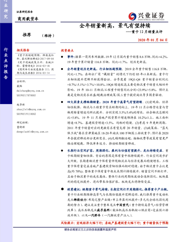 【兴业证券】【20200104】全年销量新高,景气有望持续---重卡12月销量点评-5页