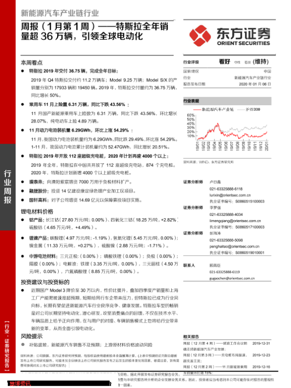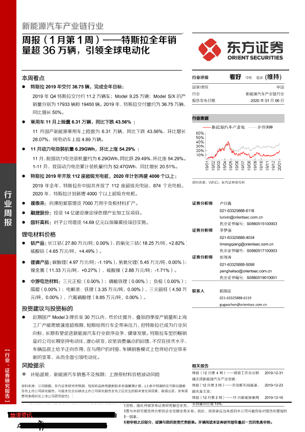 【东方证券】【20200106】20200106-东方证券-新能源汽车产业链行业周报(1月第1周):特斯拉全年销量超36万辆,引领全球电动化-26页