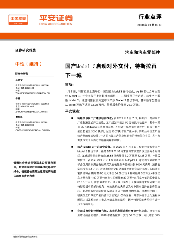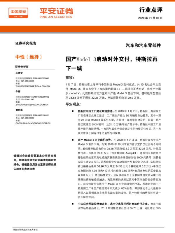 【平安证券】【20200108】汽车和汽车零部件:国产Model3启动对外交付,特斯拉再下一城-4页
